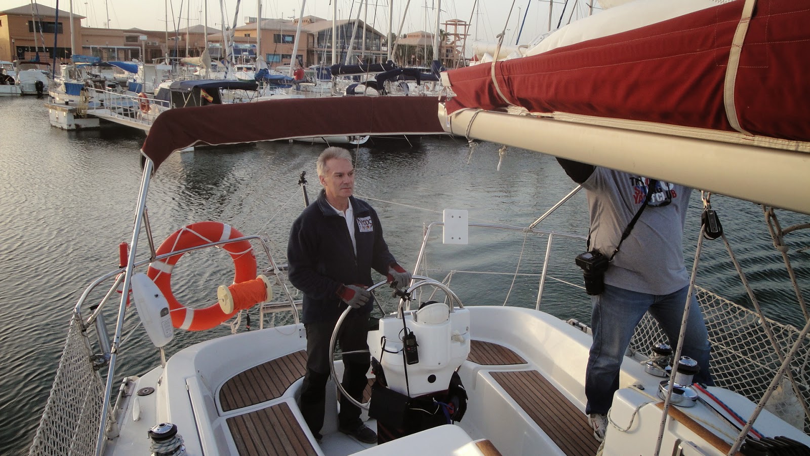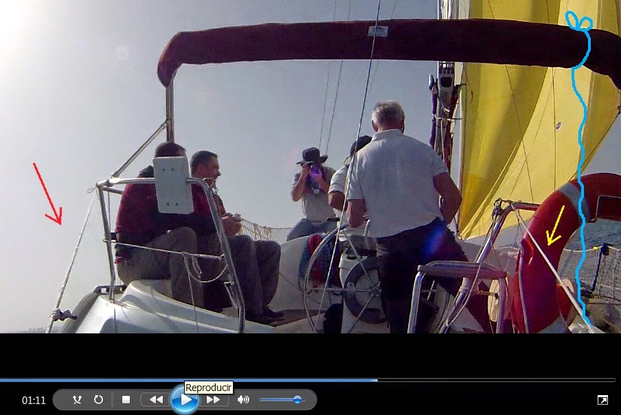 Aquí lo tenéis montado saliendo de puerto, pero FIJO. (No nos la jugamos en según qué maniobras). La braza de babor es la que soltamos y pasamos sobre la estructura del BIMINI, y así podemos hacer travellings desde aleta babor hasta sobre-cubierta estribor. Como la cámara apunta hacia el tangón, y éste está fijo en el estay, la cámara siempre tiene el estay dentro de su campo de grabación.