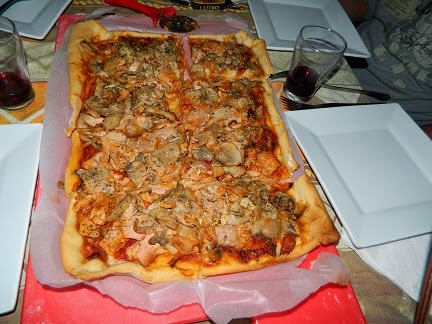 Es un plato de origen napolitano y las primeras pizzas eran unas tortas de pan apenas aromatizadas con hierbas y aceite. En Italia la pizza se suele comer en restaurantes donde se elabora de forma tradicional en hornos de leña especiales, donde el “pizzaiolo” se encarga de elaborarlas. Ingred para 2 pizzas medianas. 200 gr. agua 300 gr. harina (mejor si es harina de fuerza) ½ cucharadita de sal 1 sobre de levadura seca de panadería (ó 20 gr. levadura fresca) 15 gr. aceite de oliva virgen extra Prep. Para la masa Mezclamos la harina con la sal y la levadura en un recipiente amplio. Hacer un agujero tipo volcán en el centro y añadir el agua templada, en torno a 37º, y el aceite de oliva. Remover bien con un tenedor hasta que quede una masa tal que se desprenda de las paredes del cuenco. Enharinar la mesa ligeramente elaboración Proceder al amasado, para que la masa quede elástica y suba bien: Aplastar y estirar la masa con la base de la mano derecha, doblar la masa por la mitad y presiona de nuevo con la base de las dos manos. (Hace falta más paciencia que fuerza, lo digo porque las primeras veces, suele ser al revés y acabas sudando a mares, Pero es cuestión de práctica, como todo) Repetir el proceso de forma continuada durante cinco minutos. Mientras, se espolvorea de vez en cuando un poco de harina en la mesa de trabajo y en las manos, para que no se pegue mucho, pero siempre en pequeñas cantidades para no endurecer mucho la masa. Para que quede muy elástica hay que proceder al refinado de la masa. Para refinarla aplastar y retorcer la masa, girándola y dando forma alargada sobre la mesa. Unir los extremos y amasa con los puños hasta fusionar el conjunto. Repite el proceso de amasado y estirado durante 5-10 minutos. Pasar la masa, que debe quedar lisa y elástica, a un cuenco amplio ligeramente aceitado; cubrirlo con film transparente o con un trapo limpio y dejar fermentar en sitio cálido durante 30-40 minutos, o hasta que doble su volumen. Una vez fermentada, pasar a la mesa enharinada y aplastar la masa con los puños suavemente para eliminar el exceso de gas formado en el interior. Cortar en dos o tres porciones y estirar la masa con rodillo sobre la mesa, hasta que quede fina, máximo unos 3-4 mm. o del grosor que queramos Si os sentís pizzaiolos, lanzadlas al aire y con la punta de los dedos la hacéis "bailar" Si se cae al suelo repetid (toda) la operación de nuevo ![]() Poner los ingredientes que queramos (tomate en rodajas o triturado, mozzarella, anchoas, aceitunas, etc.), regar con un hilo de aceite de oliva virgen y hornear a horno muy fuerte, 250º-290º unos 10 minutos, o hasta que quede crujiente y dorada.