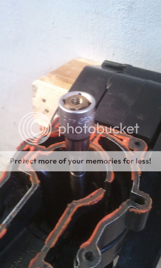Aprovechando una pata completa de un motorcete que se niega a arrancar, quitamos la parte motor y queda el eje. Casualmente coincide con una boca de llave de carraca y casualmente tengo una tuerca de colector de escape que coincide con llave y eje del motor.