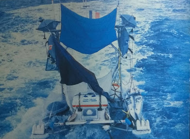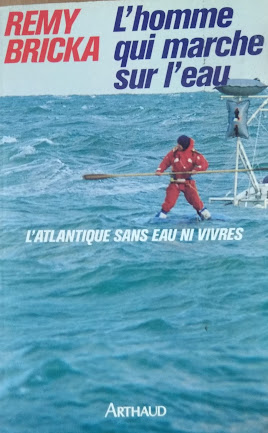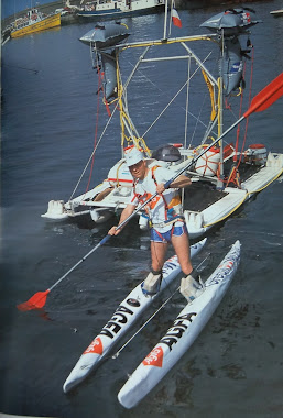 Sí, lo habéis leído bien. En 1988 el francés Remy Bricka cruzó el Atlántico andando sobre el agua con unos esquís. Los 80 y los 90 fueron unos años raros, en que la gente se lanzó a cruzar los océanos en los artilugios más variados, por supuesto jugándose la vida. Lo contó en el libro "L'homme qui marche sur l'eau, l'Atlantique sans eau ni vivres" ("El hombre que anda sobre el agua, el Atlántico sin agua ni víveres") uno de esos libros que son un pedazo de vida más que una creación artística, y cuyo título lo dice todo. Remi era de profesión "hombre-orquesta", dando espectáculos en los que era capaz de tocar 27 instrumentos a la vez. Había salido en programas de televisión, tenía un disco de oro con una de sus canciones (más de 250.000 ejemplares vendidos) y figuraba en libro Guiness. Pero simultáneamente había perfeccionado un sistema de desplazarse sobre el agua con una especie de esquís, que en realidad eran unas piraguas de 4,2 metros de largo y 0,32 metros de ancho, o sea, un poquito más pequeñas que un kayak de mar. Se equilibraba con un remo doble con el mango larguísimo (3,80 metros) para poder usarlo de pie. Los dos esquís estaban unidos entre sí por unos cabitos para que no se abrieran y le rompieran las caderas, igual que atan las patas a las vacas cuando van a un mercado de ganado con el suelo resbaladizo. Con este sistema había cruzado previamente el Canal de la Mancha y el Mediterráneo. Afirma que podía alcanzar una velocidad de 4 a 5 nudos. La única experiencia de navegación de altura de Remi había sido un curso de una semana en la escuela Glénans. Para la travesía del Atlántico necesitaba un habitáculo donde dormir, refugiarse en las tormentas y llevar el material de supervivencia. Agua y comida no llevaba, porque además de la hazaña deportiva quería hacer una demostración de supervivencia, y salió sin nada. El habitáculo pretendía llevarlo a remolque de su cuerpo y era una especie de sarcófago sobre unos flotadores de catamarán, y pesaba 300 kg. Como veis en la foto, llevaba una balsa salvavidas homologada, una "bulla" para ver el mar encerrado en el interior, y una superestructura con unos depósitos arriba que no contenían agua sino aire, para que en caso de vuelco el sarcófago se enderezase solo. La balsa salvavidas no llevaba las raciones habituales de agua y comida, para "no hacer trampa". En el sarcófago apenas cabía sentado ni tumbado, y de hecho en los primeros días de la travesía prefirió prescindir del colchón inflable, con lo que ganaba unos 10 cm de altura en el interior a costa de dormir sobre el suelo. El tema de la supervivencia lo había preparado a conciencia. Como sabía que iba a salir sin víveres acudió a un nutricionista, que le obligó a una alimentación hipercalórica para acumular reservas para el largo periodo de ayuno que se avecinaba, consiguiendo ganar 6 kg. Llevaba varios destiladores de agua de mar, un desalinizador por ósmosis inversa, redes de plancton, material de pesca y un fusil de pesca submarina. La salida la hizo desde Tenerife, con destino final la isla de Guadalupe. El gobierno francés le había negado el permiso de salida, y el español le había hecho firmar un documento prohibiéndole la salida, pero él se escabulló hasta llegar a las aguas internacionales. Allí empezó una larga deriva de dos meses hasta que fue recogido por un barco de pesca japonés cerca de la isla de Trinidad. El sarcófago intentaron remolcarlo, pero se perdió por el camino, acabó llagando a una playa y allí le robaron todo, hasta los tapones de oído usados y el cepillo de dientes. Su experiencia puede valorarse desde tres puntos de vista: En el aspecto deportivo, Remi afirma que cruzó el atlántico sobre los esquís, lo que es muy dudoso. Quiere que nos creamos que cuando llevaba un mes sin probar bocado (su primer dorado lo pescó al mes) o al final de la travesía, donde había perdido ya 20 kg y sólo había comido 15 peces en 2 meses y por lo tanto estaría emaciado como los prisioneros de los nazis, esquiaba de 8 a 10 horas diarias. Incluso dice que intentó fabricarse una especie de estay y de backestay que sujetaran su propio cuerpo sobre los esquís cuando la debilidad le vencía (no confirma si finalmente los hizo, pero da idea de su estado) y que a veces esquiaba dormido (!). Las velas que había colocado en el sarcófago, hechas con los sacos de dormir y la colchoneta (que se ven en la siguiente foto, tomada desde el barco que le rescató) afirma que las puso en el segundo mes de la travesía y que eran sólo para liberarle del peso de arrastrarlo, no para desplazarse él. Además llevaba dos cometas como las de kitesurf. La primera la utilizó una semana, hasta que la perdió en el océano, y la segunda no fue capaz de hacerla volar. Por todo ello podemos suponer que hizo parte de la travesía "a vela" en esa balsa. De todos es sabido que cualquier cuerpo flotante echado al mar en Canarias llega al Caribe en 2-3 meses, arrastrado por las corrientes y los vientos, y en eso se basan muchos aventureros. Es cuestión de resistir. El aspecto de navegación también fue un desastre. Salió sin un navegador por satélite a propósito, sólo con una baliza Argos que enviaba su posición a su familia, aunque él no la conocía. Afirma que hacía cálculos de navegación astronómica con un sextante de plástico y un reloj de pilas, y eso después de haber sufrido varias inundaciones que con seguridad habían dañado los libros de las efemérides, y estando en un estado mental que a veces le provocaba alucinaciones, amén de las sabidas dificultades para tomar posiciones desde una embarcación tan pequeña y la falta de espacio hasta para hacer los cálculos sentado. Además cometió desde el principio un error de paralaje, pues no llevaba el compás frente a sí sino en el esquí derecho, con lo que el rumbo lo veía siempre 2-3 grados más hacia el Norte del real. El hecho cierto