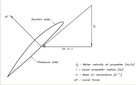 La velocidad en cada sección de hélice varía según su distancia al eje, pero las palas se construyen para que el paso se mantenga constante desde la raíz de cada pala a su extremo. ![]() El paso se optimiza para una velocidad determinada, la velocidad dependerá de la potencia que tengamos y de la curva de resistencia al avance del barco, que además será distinta para mar en calma y para condiciones de viento y mar fuertes. Para transmitir esa potencia, el diámetro de la hélice es fundamental y su área también. Dejando esos parámetros aparte, el paso óptimo será el que permita que los perfiles de las palas produzcan el mayor empuje posible. En realidad se escoge una hélice calculando los requerimientos óptimos de diámetro y paso para una potencia determinada (que permite unas velocidades determinadas según las condiciones). Normalmente se escoge la hélice cuyo producto de diámetro x paso se ajusta más al producto de diámetro y paso óptimos. Por lo tanto, si tenemos el motor decidido para un barco concreto, y escogemos la hélice más adecuada para las situaciones más importantes: velocidad máxima con mar calma y potencia ante mar y viento formados; el que marcha atrás la hélice tenga menos revoluciones simplemente nos indica que obtendrá su máximo rendimiento a menor velocidad, porque la componente vectorial 2pi*n*r será menor (y para mantener el ángulo de ataque de la pala óptimo, la velocidad también debe ser menor). El proceso de cálculo está explicado aquí. Un saludo ![]()