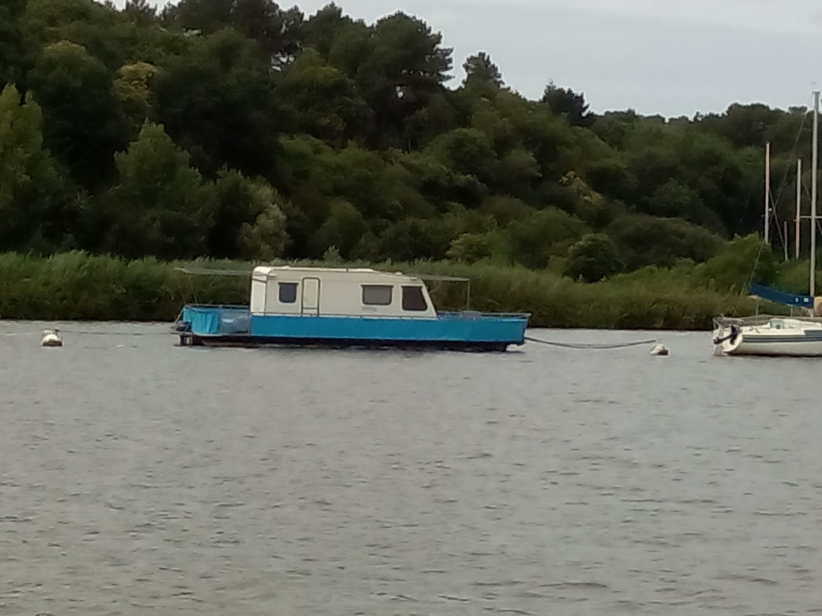 quizá sea que el camioncillo esté llevando la casa flotante. Lo de plataforma flotante con caseta encima se estila bastante en eeuu, siendo el casco como el de la foto, o con dos flotadores o tres alargados (como un cata o trimaran "rústicos")