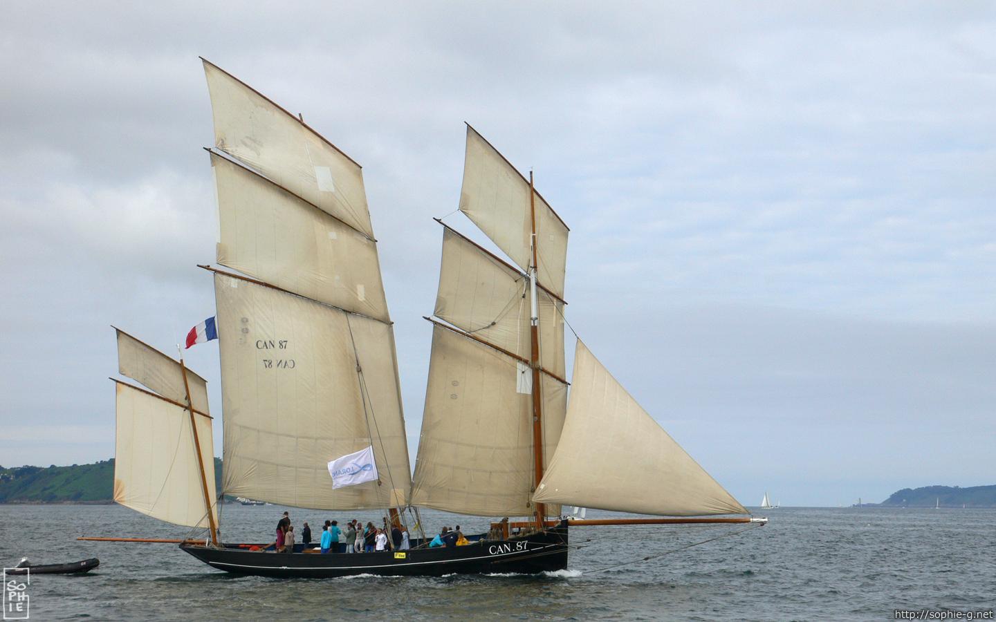 Ala, a descansar del tocho. Otra foto para premiar a los que han llegado al final: se trata de la bisquine "La cancalaise", de Cancale, claro. Su aparejo al tercio alterna las vergas a babor y a estribor de los respectivos mástiles. Así consiguen que por lo menos en un palo las velas trabajen bien.