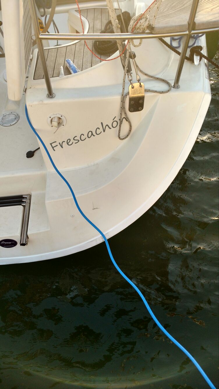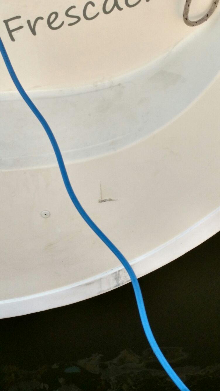 Esta tarde, tras 50 estupendas millas de navegada de Oristano a Carloforte, con 25-30 nudos de portantes, un descuido al atracar al tomar la guía del puerto nos ha hecho dar un golpe al Frescachón que le ha hecho un pequeño "siete" en la fibra. Adjunto imágenes del desaguisado :