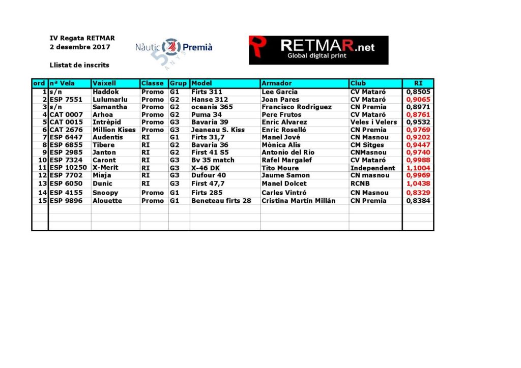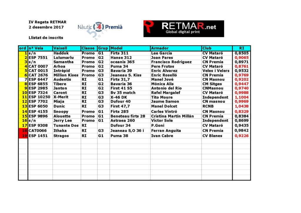 Es imprescindible la inscripción en la Regata, los inscritos en el Trofeo Comodoro la inscripción del barco es GRATUITA, en la hoja de inscripción: Clica: inscripcion On-Line seleccionar Regata RETMAR y en comentarios indicar la/s Talla/s de la camiseta de la Regata que estarán personalizadas con el nombre del barco y el nº de vela. A partir del 12 de noviembre no podemos garantizar la camiseta, no espere a última hora para hacer la Inscripción. Se debe abonar el importe del Lunch (10 € / persona) vía transferencia bancaria o bien indicando cargo en cuenta corriente en el caso del Socios del Náutico Premià.