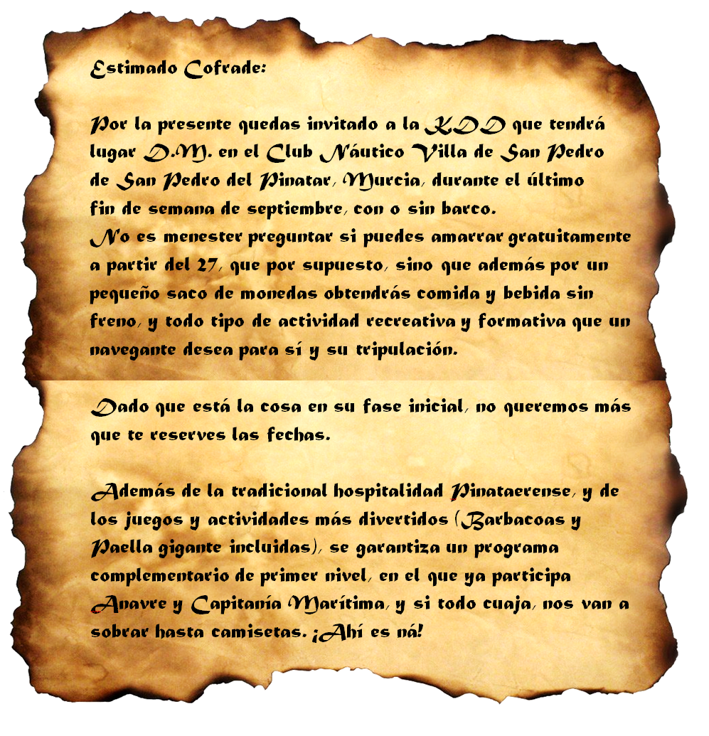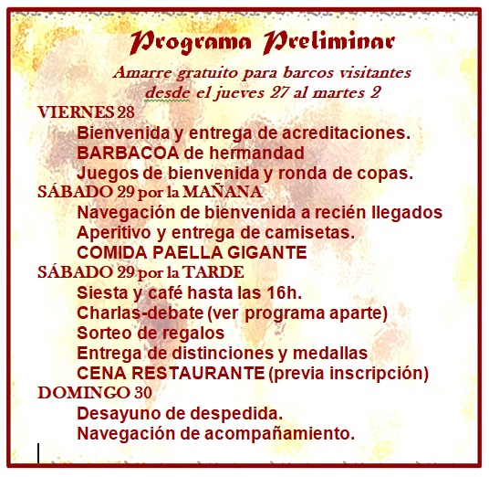 ... poca gente me parece a falta de dos semanas.....Vamos a poner unas golosinas a ver si se os quitan las dudas de última hora... ¡¡¿NO HABÉIS TRAMITADO LOS PERMISOS ANTE EL ALMIRANTAZGO?? !! En estas dos semanas tenemos que llegar a 130 participantes, para batir el record de 2014. A ver si puede ser..... Para ello, espero que sea de su agrado el siguiente programa que hemos preparado..... ![]() ![]() ![]() ¡¡¡ EL PROGRAMA !!! ¡¡¡ EL PROGRAMA !!! ![]() ![]() ![]() ![]() ![]() ![]() ![]() ![]() ![]() ![]()