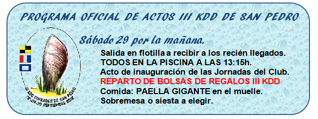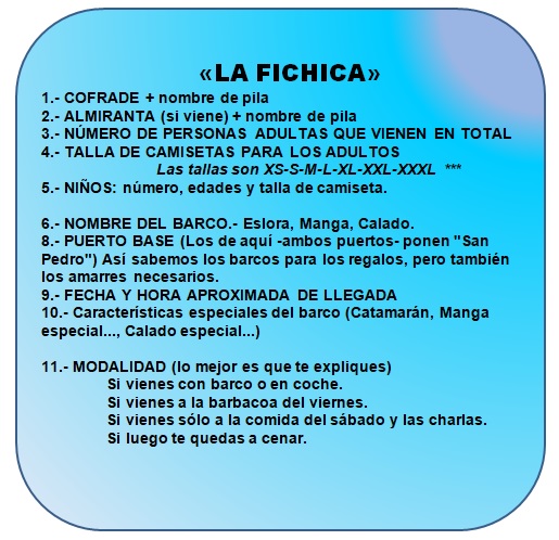 ![]() PUES VAMOS CONCRETANDO LA LISTA, POR FAVOR. SI NO QUERÉIS QUE APAREZCA ALGÚN DATO, ME LO INDICÁIS POR PRIVADO (yo iré publicando la lista actualizada) ES IMPORTANTE CUMPLIMENTAR TODOS LOS DATOS LO MEJOR POSIBLE. ![]() EL PRECIO (Y ES MUY DIFÍCIL QUE SUBA) DE TODO EL PACK DE KDD+REGALOS+CAMISETA+COMIDA SÁBADO+CHARLAS+CAFÉ ES DE ¡¡¡ 25 EUROS !!! (10€ niños de 12 años o menores) ¡¡¡ LA KDD MÁS BARATA DEL MEDITERRÁNEO !!! ![]() (incluso más barata que la anterior) LA CENA VA APARTE Y SE PAGA EN EL MOMENTO, y se estima entre los 15 y los 20 euros. Copas aparte lógicamente. ![]() ![]() Edito: OS COPIO LA FICHICA EN TEXTO PARA COPIPEGUI 1.- COFRADE + nombre de pila 2.- ALMIRANTA (si viene) + nombre de pila 3.- NÚMERO DE PERSONAS ADULTAS QUE VIENEN EN TOTAL 4.- TALLA DE CAMISETAS PARA LOS ADULTOS Las tallas son XS-S-M-L-XL-XXL-XXXL *** 5.- NIÑOS: número, edades y talla de camiseta. 6.- NOMBRE DEL BARCO.- Eslora, Manga, Calado. 8.- PUERTO BASE (Los de aquí -ambos puertos- ponen "San Pedro") Así sabemos los barcos para los regalos, pero también los amarres necesarios. 9.- FECHA Y HORA APROXIMADA DE LLEGADA 10.- Características especiales del barco (Catamarán, Manga especial..., Calado especial...) 11.- MODALIDAD (lo mejor es que te expliques) Si vienes con barco o en coche. Si vienes a la barbacoa del viernes. Si vienes sólo a la comida del sábado y las charlas. Si luego te quedas a cenar.