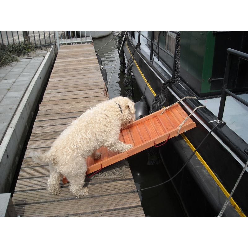 Yo compre una pasarela para perros que ademas se dobla por la mitad,le hice dos anclajes para la proa del barco y me va de lujo.precio total no llego a 100 eur.