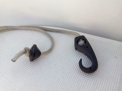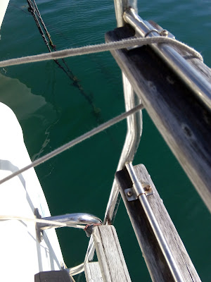 Hemos probado varias veces que es posible agarrarse a él y remontarlo, nudo a nudo, hasta llegar al espejo de popa. Lo hemos probado hasta con niños. En el Corto Maltés mide unos 30 metros, lo que a 4 nudos significa que dispones de unos 15-20 segundos para reaccionar y agarrarte. Tiempo más que suficiente, y eso si nadie se da cuenta de que te has caído. Si el que se queda a bordo se da cuenta, suelta las escotas para frenar el barco o lo pone al pairo, el tiempo para reaccionar es muchísimo mayor y la facilidad para llegar a la popa también. Y te ha evitado una maniobra de recuperación que siempre es angustiosa. Los errores más habituales esta línea de vida de arrastre son: 1) No poder soltar la escalerilla desde el agua. La mayoría de las escalerillas de popa se tienen amarradas con algún sistema para no arrastrarlas mientras se navega, y esos sistemas de anclaje se manejan desde la bañera. Si no puedes soltarla desde el agua no puedes subir a bordo aunque hayas alcanzado el espejo de popa. Yo trasladé el gancho de sujeción a uno de los peldaños inferiores, para alcanzarlo desde el agua: y cambié el gancho cerrado, que necesita las dos manos, por un sistema de ojal que se puede soltar con una sola (a la izquierda el nuevo, de ojal, y a la derecha el antiguo, de gancho): 2) Amarrar la línea de vida en el lado contrario a la escalerilla. Así la llevaba yo en el Corto Maltés hasta que comprobé que se podía llegar hasta el espejo de popa nudo a nudo, pero que una vez allí, con el barco en marcha, era casi imposible pasar al otro lado de la pala del timón. 3) Olvidarte del fueraborda si está en marcha. En el Corto Maltés el fueraborda está en el mismo lado que la escalerilla, a estribor, y si llego a la escalerilla estaría flotando pegado a la hélice, que puede lesionarme. Es peligroso intentar quitar desde el agua el sistema de seguridad ("hombre al agua") porque lo harías muy cerca de la hélice. Lo único práctico es utilizar el extremo de la propia línea de vida para acercarla a la hélice, que la trabe y pare el motor. Una vez parado, como ya estás en el agua aprovechas para quitarla. 4) Olvidar que llevas la línea de vida al cruzarte con otros barcos, o al entrar a puerto. Si un barco a motor te corta la estela puede trabar el cabo con su hélice. Y es muy habitual olvidarte de recogerlo al llegar a puerto, y cuando alguien te avisa tienes que ponerte a recogerlo en mitad de la maniobra de amarre, complicándolo todo. 5) Creer que porque el cabo es flotante no puede trabarse con la hélice. Aunque es menos probable que si el cabo se hunde, un cabo flotante también puede trabarse en la hélice. Si estás encalmado y arrancas el motor, al meter avante la cavitación que genera la hélice puede absorber el cabo hacia abajo y engancharlo. Me ha pasado algunas veces. Hay que meter avante apartando el cabo con el bichero. 6) Olvidarte de la línea de vida en las encalmadas o al ponerte al pairo. En estos casos la pérdida de velocidad puede hacer que la línea de vida se acerque al barco (en realidad es al revés: el barco retrocede y se echa encima de la línea de vida) y se organiza el lío con la orza. Como lector habitual de revistas de náutica siempre me ha sorprendido que casi nadie lleve este sistema de seguridad, que puede salvarte la vida. Y he comprobado que la mayoría de las situaciones de "hombre al agua" se habrían resuelto inmediatamente de haberlo llevado, que siempre es útil salvo que el náufrago está inconsciente. Por mi experiencia con otros navegantes que han pasado por el Corto Maltés la principal pega que le ven es la sensación de que "te frena", porque efectivamente al recoger la línea de vida sientes que "tira" mucho. Pero claro, nos falta la comparación con lo que "tira" la totalidad de barco (en el Corto Maltés, una masa de 1.500 kg abriendo el agua a su paso) y tenemos que hacer un acto de fe en lo que está publicado de la resistencia de otros objetos arrastrados, o más sencillamente mirar en nuestro GPS si disminuye la velocidad al echar la línea de vida. En el GPS de a bordo no se nota. Y hay otros dispositivos de arrastre, como los hidrogeneradores o las colas del fueraborda, que se ha calculado que frenan al barco sólo unas tres décimas de nudo. Si un hidrogenerador lo frena eso, un cabito arrastrando por la superficie lo hará unas centésimos de nudo, algo despreciable en una travesía. Pero es sólo una opinión y puedo estar equivocado.