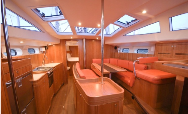 El que yo probé, durante cuatro días en Saint Maló, estaba nuevo, tendría poco más de seis meses. No tenía orza, si no un derivador retractil que se metía mediante un cabo debajo del respaldo del asiento del salón.