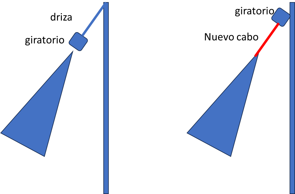 El giratorio tiene que estar a tope, si la génova no llega hasta arriba y tienes el giratorio unos palmos más bajo del tope, y la driza dada al giratorio corre paralela al stay, es típico que se te líe sobre dicho stay. Si es tu caso simplemente utilizas un cabo desde el puño de driza del génova hasta el giratorio, de la longitud necesaria para que el giratorio quede arriba del todo. Te lo intento dejar pintado: ![]() ![]()