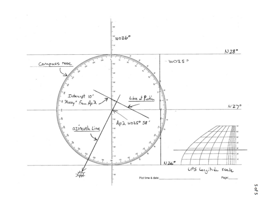 Es la opción si no hay cartas o no se quieren manchar. Una escala en un folio, una recta con el angulo de la latitud media y unas lineas verticales para aplicar la escala que cada uno desee. En la linea horizontal se mide la Longitud y en la recta con angulo se mide la latitud y las distancias.