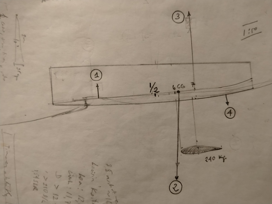 Trasteando con los dos Tarugos de Hörner sobre mecánica de fluidos la cosa pinta fatal ... puede ser por ejemplo un Coeficiente de entre 1,1 y 1,8 (!!!) por el Seno por el Coseno del Angulo (A) de la Proa por Presión Dinámica (q) por un buen trozo de la Flotación (LWL) y el calado del Hull/Casco (h) por 0,8