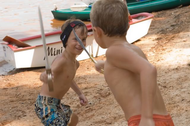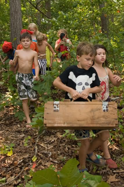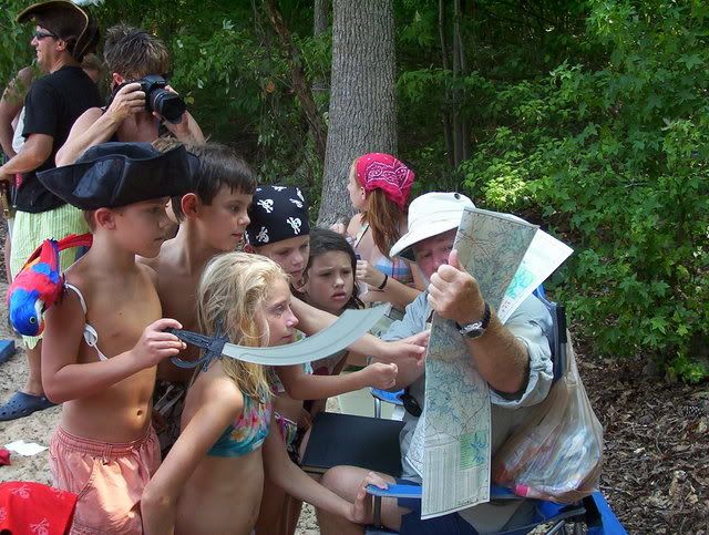 Como cada agosto (en Julio mi mujer prepara una paella en la playa para todo el cub), el dia antes se preparo el baul (una antigua caja de municiones del ejercito que compre en una tienda de surplus) lleno de “tesoro”. Doblones de chocolate, pistolas de plastico, caramelos, etc. Bamos digno del pirata mas temido del caribe. El tesoro se esconde (preferentemente enterrado a poca produndidad) y se prepara el mapa del tesoro. El mapa deberia esta dibujado en “pergamino” (papel marron con los bordes quemados). Es una gran oportunidad para pasear a los ninyos por toda la playa contando pasos, tomando rumbo de compas (se les da una brujula de plastico), marcaciones, etc. La inmaginacion es el limite. Si el “camino” es muy largo conviene dejar alguna “pista” como “armas abandonadas” (espada de plastico), o para los mas macabros algun esqueleto o calabera de plastico (quizas no para los mas pequenyos).
