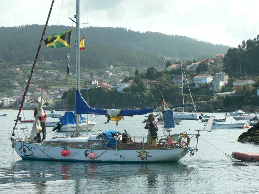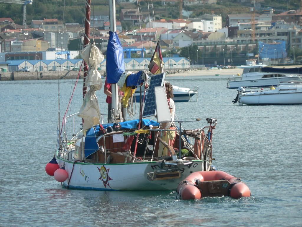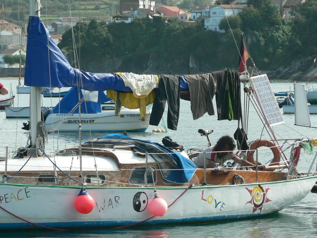 De todos modos Brullos ¡anímate!, no es necesario mucho dinero para navegar. Como es habitual casi siempre que voy a visitar el barco desde que lo compré es para hacer algún arreglo. Bien pues un día me encontré con estos navegantes atracados al lado de mi muerto, en otra boya. Flipe y me hizo pensar que la felicidad que busco no me la da el tener un barco sino DARLE USO. Pero claro para eso hay que tener la vida que te lo permita. Sinceramente los envidio. Han bajado dos alemanesjóvenes de menos de 30 años y un perrillo faldero en un barco casí de quilla corrida pero con un pequeño apendice abatible desde Alemania y van a Canarias. Hoy duermen en Cies. Aprovechan el norte que soplará estos días para bajar al sur por la costa Portuguesa. El barco metálico, con remaches en algunas zonas, tiene ¡65 años! o eso entendí. Las velas pues ya las veis. El timón de viento hecho por unos colegas. Los peldaños del mástil hechos de pletina de aluminio por ellos remachados al palo. El motor de 6 CV intraborda que les impide ceñir cuando el viento sobrepasa los 4 Beaufort. Un barco mal ceñidor a vela además...Y lo más importante les costó 1.500 Euritos. Eso sí restaurado por ellos como veis...¡Si es que soy Millonario !.![]() ![]() ![]() ![]() |