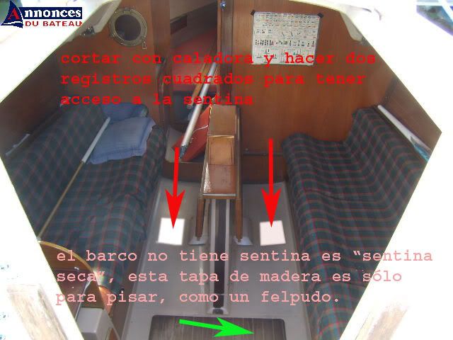 Hola mi barco no tiene sentina (first 25, orza abatible), me explico es de los que llaman de "sentina seca". He consultado con una persona que trabaja la fibra y me ha aconsejado que para quitar el agua que tiene (además salada y que creo que entra por el pozo de anclas ), podría cortar con una caladora el piso y hacer un registro cuadrado, así podría acceder al fondo y con un trapo secar el agua. En fín que opinais, yo tengo mis reservar para todo lo que sea taladrar y cortar en un barco, pero después de 27 años que tiene este me temo que, por su bien, el del mantenimiento, tendré que hacerlo. Hay filtraciones por las ventanas cuando llueve y por el palo y la verdad para atajar el problema por "arriba" le voy a meter una lona de fondeo y santaspascuas (eso espero), y luego a ver que pasa. En fin no sé si esto puede desvalorizar un barco, el meterle la mano me refiero, aunque intentaré que no sea una chapuzada. También estoy pensando meter rejillas de ventilación en la tapa de la escalera que da acceso al motor intraborda que mi barco no tiene (es fueraborda en pozo). Aquí guardo las velas.