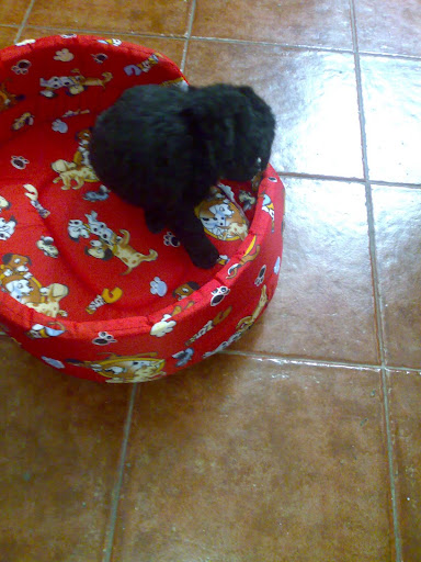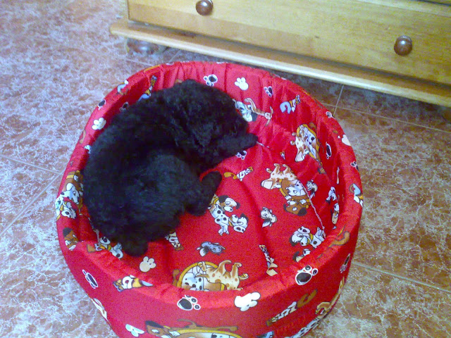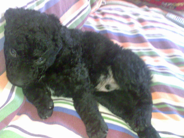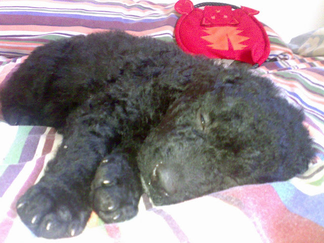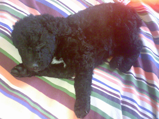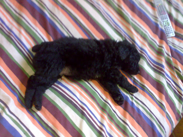 Me tiene loca, es un bichejo. Se pasa casi todo el día durmiendo, o meando por todos lados, y llora al ver a mi Nell, que la pobre a su lado es enorme y se ha acercado a olerla y darle un lametón de bienvenida (y yo babeando viendo a mis 2 tesorillos) Pero una imagen vale más que mil palabras, así que os enseño a mi bola negra, el pequeño Cachalote