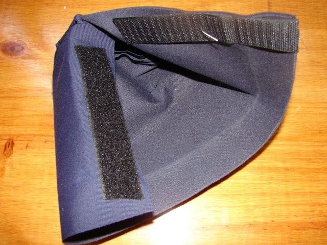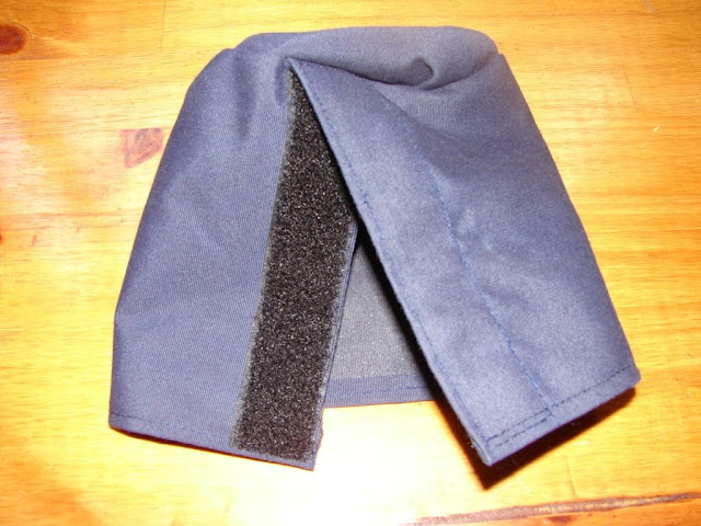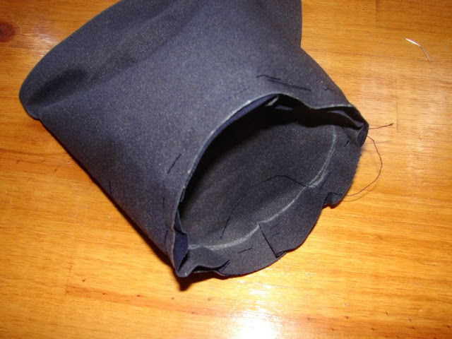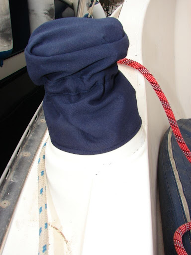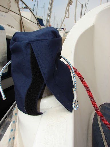 Para no tener el elástico suelto le hice la presilla, y por dentro paso el cabito. Al principio iba a coser el cono de la funda cerrada, pensando en coserle hilo elástico de los que venden en mercerías. Hice la prueba antes de coserlo, así lo hilvané pero al probarla costaba mucho de meter. Para que entrara holgadamente ya la tendría que haber hecho mucho más anchota y puesta quedaría más fea. Con el velcro se mete fácil y se ajusta, y sacarlo lo mismo. Vamos, la ley del mínimo esfuerzo, que estoy cansada de pelear con los elementos del barco . Si metiera el elástico por dentro estaría en las mismas, costaría de meter, y lo que buscaba es hacer el mínimo esfuerzo y que a la vez quedara bien sujeto. Por otro lado la presilla que sujeta el cabo no rodea todo el cono. ¿Por qué? Piensa que al cerrar el cabito y ajustarlo encoje, vamos que se apretar arrugada a la base del winche, y el elástico ha de ser algunos centímetros menos que el díametro, precisamente para que quede bien sujeto.