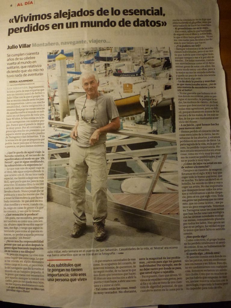 SAN SEBASTIÁN. Seguramente, la única parte de esas etiquetas que son un intento inútil de definir a Julio Villar con la que el propio Villar se sentirá cómodo serán los puntos suspensivos. Lleva con mucha amabilidad, cierta resignación y enorme desapego las consecuencias de aquella vuelta al mundo en solitario en un barquito de vela que, hace 40 años, le hizo entrar en la lista de navegantes con nombre propio. Parece que el pasado le importa muy poco. Por el contrario, le preocupa mucho un presente que reparte entre un pequeño pueblo de Tarragona y San Sebastián. Y da la sensación de que se pregunta qué podría hacer para que el futuro sea, o parezca, un poco menos siniestro. – ¿Qué le queda de aquel viaje: la hazaña náutica, el recuerdo de aquellos años o el modo en que ‘¡Eh Petrel!’, que se sigue reeditando, ha sobrevivido a la experiencia? – Lo que más vale de aquel viaje es el libro. Me sigue sorprendiendo lo que ocurre con él. Yo no hice nada especial, me limité a elegir una vida fácil, opté por lo que me parecía más atractivo. El mismo libro lo escribí a salto de mata en cuadernillos que llevaba a bordo. Nunca pensé que se publicaría y mucho menos que iba a tener la trascendencia que ha acabado teniendo. Sé que está en muchas mesillas y a veces, cuando viajo, caigo en casas de gente a la que no conozco, y veo que lo tienen... – ¿Qué sensación le produce? – Me gusta, me reconforta, pero para mí también es como una conciencia. «Fuiste capaz de escribir esas cosas», me digo, y tengo que seguir intentando parecerme al que era entonces, no perder a aquella persona que escribió ‘¡Eh Petrel!’. – ¿No es mucha responsabilidad pensar que casi 40 años después la gente sigue buscando inspiración en su textos y sus dibujos? – Sí, pero sin exagerar. Lo vivo más como bagaje que como carga. Lo que sí he vivido en algún momento como carga es lo otro, el personaje, lo del navegante que dio la vuelta al mundo en un barquito pequeño. A la gente que viene con veneración por aquello siempre la trataré con cariño, pero ya me queda muy lejos, no me importa absolutamente nada. – ¿A qué atribuye que un libro tan peculiar siga a flote? – A que estamos necesitados de esas cosas, de ocuparnos del corazón, de nosotros mismos, de querernos, de no seguir modas, de no hacer lo que nos dicen que tenemos que hacer. El libro es una invitación a abrir la puerta y marcharse, a abrir una ventana y a mirar al cielo. – Tal como están las cosas, resulta muy tentador. No obstante, ante la magnitud de los problemas, ¿sirven para algo los gestos individuales? Por ejemplo, ese de no dejar rastro por donde se pasa, que usted sigue a rajatabla. – Por supuesto, claro que sirven. Vivimos de espaldas a esos gestos, pero al fin y al cabo se trata de una cuestión de dignidad personal, de que cuando te metes en la cama por la noche la conciencia no te diga que estás haciendo el gilipollas, sino que estás tratando de hacer las cosas bien. – El proselitismo no es lo suyo. – Eso nunca, salvo lo que haya podido sugerir con el libro y, sobre todo, lo que el libro haya generado. Yo no me creo nadie para decirles a los demás lo que tienen que hacer. – ¿Y si pudiera ser útil? – Siempre volvemos a lo de las soluciones individuales, pero sí es cierto que habría que contagiar más, aunque tampoco vas a ir por ahí de Mesías... De todas maneras, cuando ves movimientos como el 15-M te entran ganas de estar con ellos. En cierto modo estoy con ellos, pero a lo mejor no me he mojado todavía, y queda un poco de mala conciencia por no hacer algo más. – Lo de abrir la puerta y marcharse que mencionaba antes, ¿no es una manera de esconderse y escurrir el bulto? – Ya me gustaría que hubiera un sitios donde esconderse, pero te persigue el incendio, te persigue la radio, los molinos de viento... Al final tienes que desconectar un poco de todas esas agresiones, pero es difícil, porque estamos en manos de los necios y de los malos, de los más zafios, de los que son marionetas al servicio del dinero. – A su juicio, ¿qué hemos hecho para merecer esto? – Hemos perdido el contacto con las cosas esenciales de la tierra, las enseñanzas de los abuelos, y estamos perdidos en un mundo de datos. La parte sagrada de la vida, en la que yo creo, ha perdido importancia. Hemos estado entretenidos en otras cosas, como en vivir muy por encima de nuestras posibilidades, y así no se puede ir muy lejos. – ¿Cómo de lejos va usted en eso de volver a lo esencial? – Tampoco es cuestión de exagerar. Estamos en el siglo XXI y hay que coger todo lo bueno que tiene, que es mucho. Yo llevo un móvil en el bolsillo, he venido en tren y voy a coger un avión. No me importaría que desaparecieran todos los aviones y volviéramos a andar despacio, pero sé en qué siglo vivo. Toda esa gente tan puñetera que no come esto, que no come lo otro... me parece un poco exagerada. Tenemos en Tarragona unas vecinas suizas que han hecho una casa ecológica con las últimas novedades ecológicas suizas, consumiendo planeta por todos los lados. Hay gente así que es un peligro. La verdad es que lo único que hace falta es sentido común. – ¿Nos queda algo? – Como colectivo, el grupo humano ha perdido totalmente el sentido común. Si no, no hubiésemos llegado a esta situación. – Si queda algo, ¿dónde está? – El sentido común está donde están las patatas, está en conformarnos con menos y ser felices. Pero ojo, no en conformarnos con cualquier cosa. Entonces seríamos un auténtico chollo. Creo que en muchos aspectos habría que empezar de nuevo, revisar nuestra relación con la tecnología, coger todo lo bueno pero no depender para todo de ella....