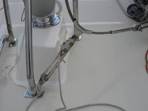 Yo lo engancho a un cadenote que este lo mas atrasado posible y le ato un cabo fino contra otro obenque para que tenga algo de tension y asi no vaya dando golpes. El cabo hay que afirmarlo a algo, un tensor por ejm, que este mas abajo, si no se sube y la tension se pierde