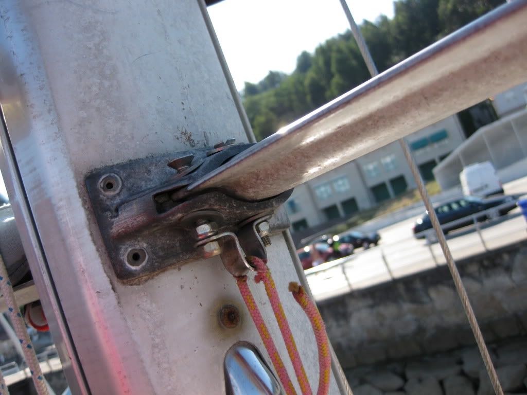 Si se te mueven las crucetas es que tienes los obenques demasiado sueltos. La cruceta trabaja a compresión sobre el palo. Por muchos tornillos que pongas mejor (los que tienes es un desastre), si sigues teniendo la jarcia floja se te van a ir.