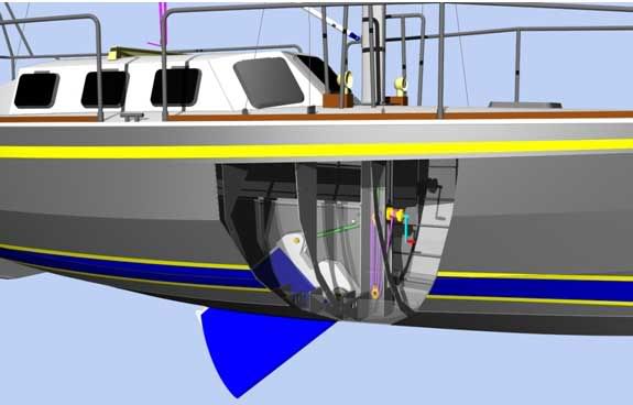 Cuanto a la opción por la quilla abatible, esa es una exigencia de los cruceristas con perfil de vuelta-mundistas, la de dotar el barco de la capacidad de reducir su calado. El Kiribati 36 cala escasos 79cm (2’7”) cuando está con su quilla recogida en plenas condiciones de carga. El lastre es dividido. Una parte se encuentra en el fondo del casco y otra en la quilla móvil. El mecanismo adoptado para izar la quilla es el más simples y confiable posible. Un molinete ubicado en la viga de sustentación del mástil acciona el izamiento por medio de dos cables de spectra 12mm, con una reducción de cuatro par uno en el sistema.