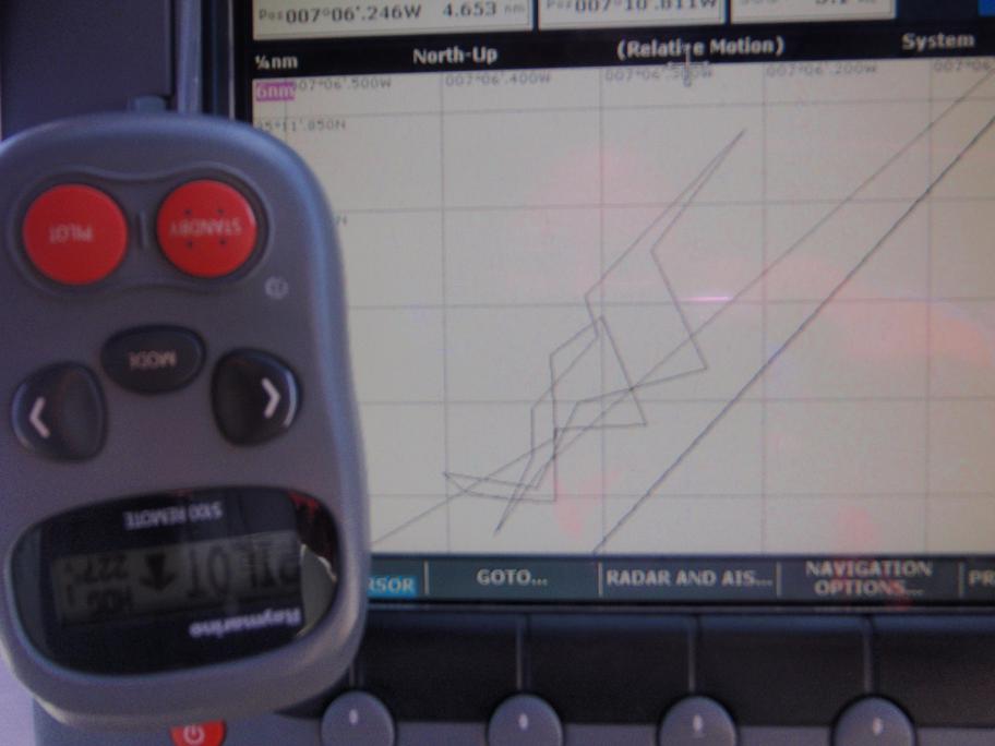 Me fui a la proa y miré y miré. Johan utilizó el track del plotter (la línea que indica el camino recorrido) para volver sobre nuestros pasos y con paciencia empezó a peinar el espacio. Mar, mar y más mar. Olas y azul por todos sitios ¿cómo iba a ver una cosita tan pequeña? apenas 12 cm flotando en el agua, llevado por la corriente. Adiós a los candeleros nuevos (habría que usar ese presupuesto para reponer el mando); menudas noches de guardia me esperaban...