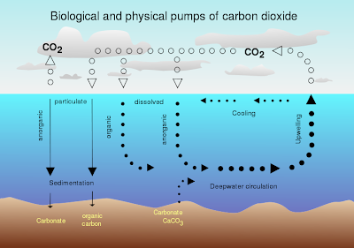 Los océanos absorben el exceso de dióxido de carbono de la atmósfera, parte del cual proviene de la quema de combustibles fósiles. En las aguas iluminadas por el Sol, unas diminutas plantas marinas llamadas colectivamente “fitoplancton” utilizan el dióxido de carbono para crecer. Luego, los animales consumen el fitoplancton e incorporan el carbono, pero la mayor parte del mismo se disuelve nuevamente en los océanos cuando los animales defecan o mueren. El carbono puede ser utilizado nuevamente por bacterias y plantas, o puede regresar a la atmósfera en forma de dióxido de carbono capturador de calor, cuando es consumido y respirado por los animales.