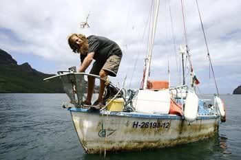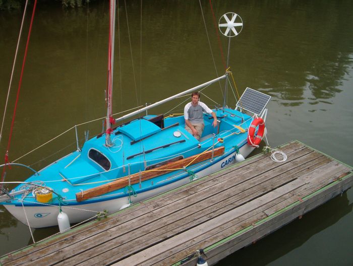 El del barco es Áron Méder, dio la vuelta al mundo en el Carina, velero de 19 pies, construido en 1970 y adquirido 34 años después por 1500 euros.