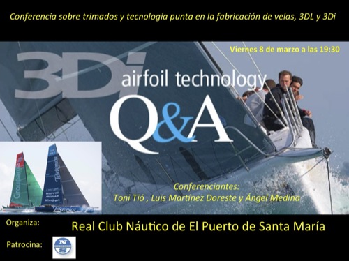 Como acto preliminar a la celebración de la 3.ª regata de la I Liga de Crucero Bahía de Cádiz, REGATA RON DOS MADERAS, que organizará este Real Club Náutico, el día 9 de marzo. Se ofrecerá en nuestras instalaciones una conferencia titulada: TRIMADOS Y TECNOLOGÍA PUNTA EN LA FABRICACIÓN DE VELAS 3DL Y 3Di, cuyo cartel-anunciador les remitimos (en pdf), la cual será impartida por TONI TIÓ, LUIS MARTÍNEZ DORESTE Y ÁNGEL MEDINA, como sabrán, todos ellos son figuras de reconocido prestigio y relevancia dentro del mundo de la vela.