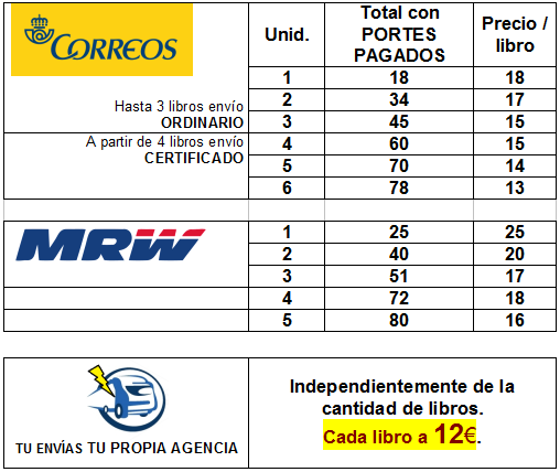 ![]() ESTA ES LA TABLITA DE PRECIOS DEL LIBRO YA PUESTO EN TU CASA O TRABAJO: Nota de abril 2017= Sujeto a ligeras modificaciones debido a variaciones de precios (cuando la variación es mínima yo asumo la diferencia, lógicamente). ![]() También puedo responder a través del correo: taxi_libertas@yahoo.es (sin prisa). PROCESO: Acordamos el envío, haces ingreso en mi cuenta, te envío el libro. ¿NO TE GUSTA?¿NO TE HA LLEGADO?¿ALGÚN ERROR? === Devolución inmediata del dinero. Sin más. Palabra de Cofrade Juanitu. ![]() ![]()