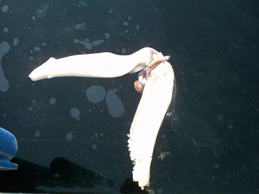 Hay vida bajo nuestra quilla. Por aquí algunos cofrades han visto morenas, y bichos de todo tipo. Si algunos de vosotros no podéis ver los fondos, seguro que esto es el más difícil todavía: ¡¡¡¡pulpos!!! y bien gordos, que en la foto parece chiquitito pero era enorrrrrme, y no es el primero que se ve ¡¡¡hay montones!!! A ver si se distingue en la foto