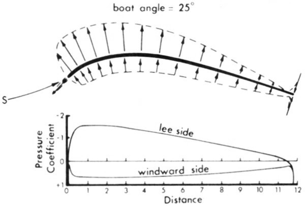 Si establecemos como valor de referencia la presion atmosferica, una presion mas baja que la de referencia sera una “depresion” y una presion superior a la de referencia sera una sobrepresion con respecto a aquella. El mapa de presiones en las dos caras de una vela trabajando correctamente se ha medido y se ha verificado como en la cara de sotavento hay una depresion, variable a lo largo del perfil y en la cara de barlovento hay una sobrepresion, siempre con respecto a la presion de referencia. Eso es una realidad medida. A partir de ahi estan las teorias que explican ese hecho. |