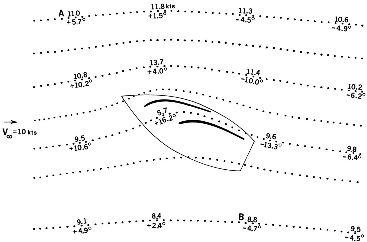 -Con diversos ángulos de ataque. -Con diversos ángulos de escora -Con diversas configuraciones de velas: una vela individual, mayor mas génova, dos velas de proa mas mayor etc etc. -Y mas variables En los ejemplos de abajo la presión atmosférica se considera valor cero de referencia y las presiones de signo positivo son sobrepresiones y las de signo negativo son depresiones con respecto a la de referencia. ![]() En esta el ángulo de ataque va variando de menor a mayor desde "a" a "c" ![]() En esta se ven las depresiones de la cara de sotavento con mas detalle, todas negativas con respecto al valor "0" de referencia de la presión atmosférica: ![]() Y en esta ultima están representadas las líneas de flujo y las velocidades de viento en cada punto (cifra superior) y la variación del ángulo del viento en ese punto (cifra inferior) con respecto a la dirección y velocidad del viento de 10 nudos en el túnel de viento, con los perfiles trabajando con el ángulo de ataque correcto. ![]() |