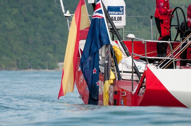El VOR70 "CAMPER" con dos banderas en su popa. Una española y otra de Nueva Zelanda.