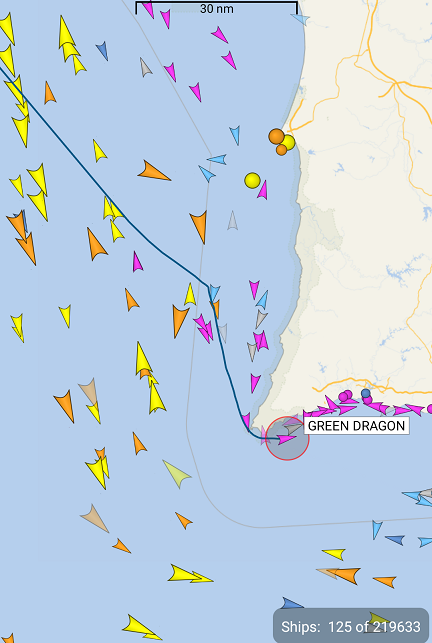 En Marine Traffic se ha quedao pillao, pero en vesselfinder se ve. Bajan a siete nudos, con 8-10 de viento pegadas a la costa al abrigo de Finisterre. Más abajo tendrán veinte nuditos de viento. |