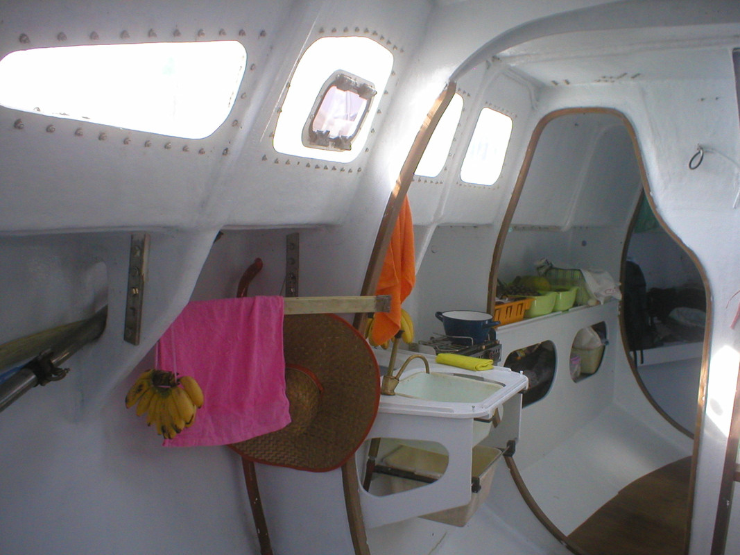 Yo viajé y viví cinco años y medio en un bañera central de 33 pies y el espacio era perfecto para una persona sola, nada de cabinas bajo la bañera, una cabina a popa de verdad, espaciosa y perfecta para dormir navegando. Con más eslora, la cabina no debe ser tan alta y la estética mejora, pero la distribución es muy agradable. ![]() ![]()