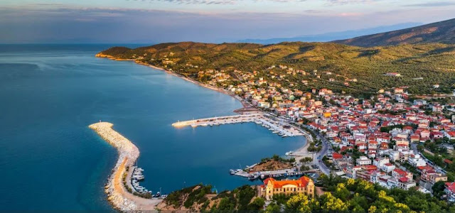 Pero en este caso las imágenes que tengo están grabadas fuertemente en mis recuerdos, ya que en mi opinión la isla de Limnos es de lo mejor que nos puede ofrecer Grecia. Tan solo la reserva que hay en la marina para una regata nos impide haber estado mas tiempo en Mirina. Por cierto que lo de la regata es un sistema de hacer una reserva a buen precio por un grupo de amigos. En este caso se trataba de un grupo de turcos y griegos relacionados con Turquía. Lo que mas demuestra que se trataba de un truco es que los barcos que llegaban y los tripulantes que los conducían, nada tienen que ver con los barcos y tripulaciones habituales en el mundo de las regatas. Nuestra intención es visitar las islas de Thasos y Samotracia antes de comenzar a bajar a Lesbos y el Dodecaneso, así que salimos en compañia de un velero Español el Epicur, de Santy y Carmen con los que hemos ido coincidiendo estos días atrás, pero que llevan otra derrota y van hacia Samotracia. Nosotros nos dirigimos a hacer noche en el puerto de Limenaria, al sur Oeste de la isla de Thasos. Como podeis ver en esta vista aerea que he sacado del Google Heart. los muelles actuales nada tienen que ver con los que figuran en nuestras cartas de navegación. Han construido un nuevo muelle en la parte Norte y Oeste de la antigua ensenada. Aún está en obras y no hay ni agua ni electricidad de momento. Nos abarloamos al muelle Oeste donde hay una gran explanada de obra para que pueda correr Drako a sus anchas.. Lo que no calculamos es que hay un acceso por las piedras al agua y se marcha directo a él a darse un baño. El problema es que se clava un erizo en una pata y una púa se le mete muy profunda entre los dedos de la pata delantera izquierda. La ciudad es para nosotros un choque brutal. La cercanía de la Costa Norte y por tanto de Bulgaria y Turquía, las fechas que anuncian el verano y las vacaciones, han llenado el pequeño pueblo de un público ruidoso y para nada glamuroso. Es como llegar a Benidorm, Torremolinos o Fuengirola. Turismo de masas, del que venimos un poco huyendo. Por la noche hay ruido, música , fuegos artificiales y cientos de coches que utilizan la plataforma del puerto para aparcar. Nos refugiamos en nuestro pequeño mundo a ver una película