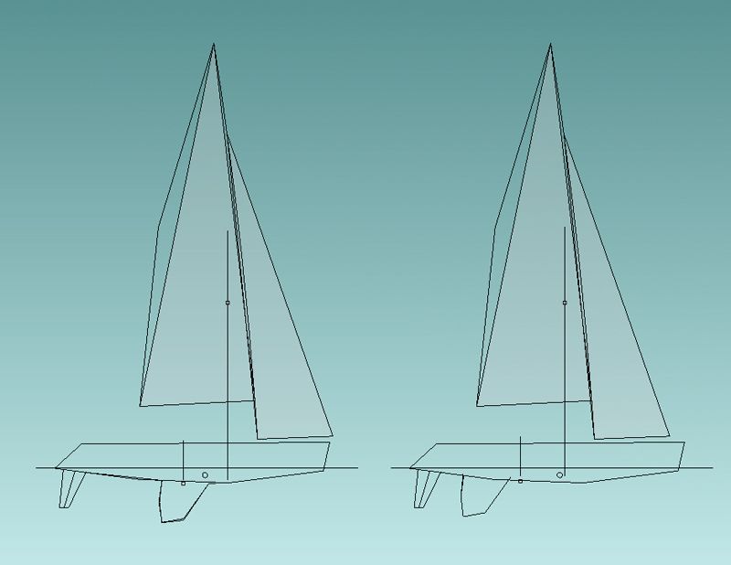Si intentamos llevar el centro de resistencia lateral hacia popa, para alejarlo mucho del centro de gravedad, nos encontramos con el velero de la derecha en la imágen: