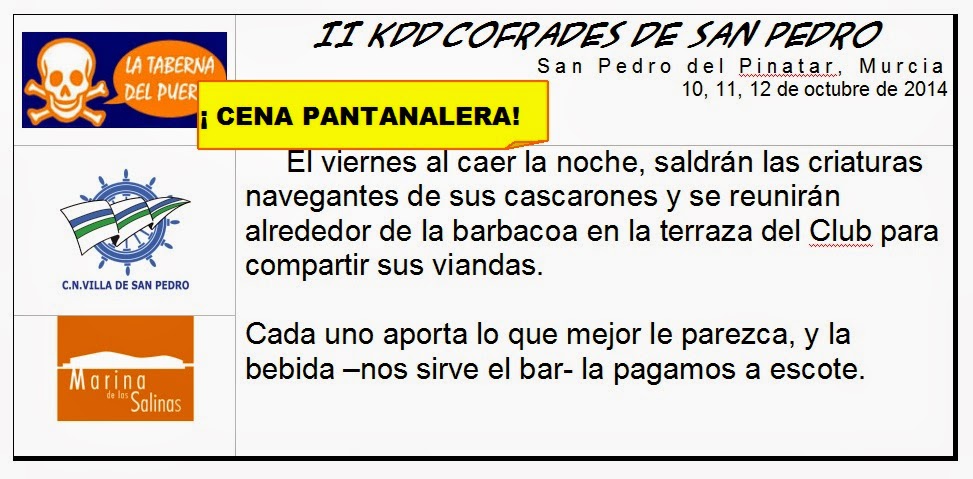 Sres organizadores, apunten dos personas para el sábado (solo comida), de momento iremos sin barco porque al dia siguiente toca cocinar caldero en Los Alcazares. Amablemente nos ha ofrecido su hospitalidad el cofrade "Amospallá" en el Ponce de Leon. |