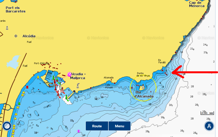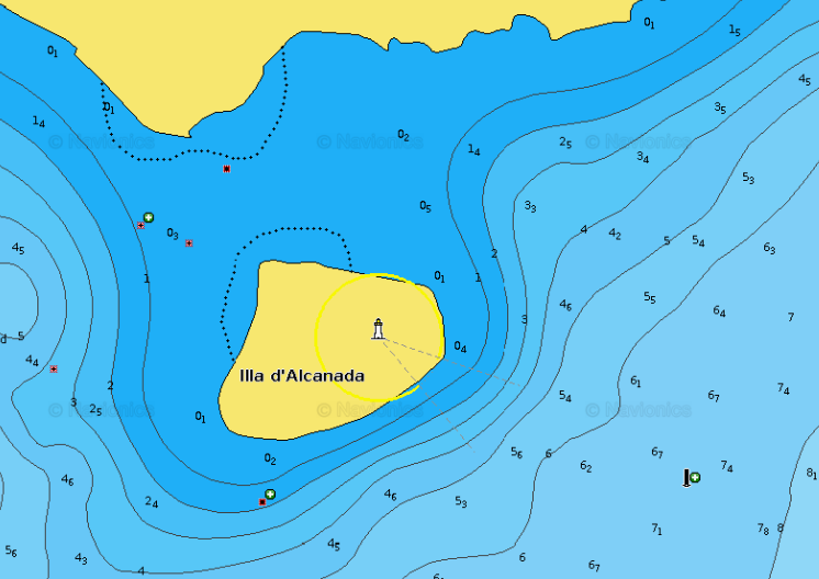 Navionics indica unas rocas a media milla al NE de la Illa d'Alcanada
