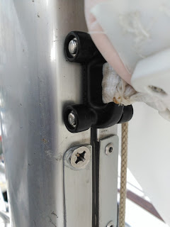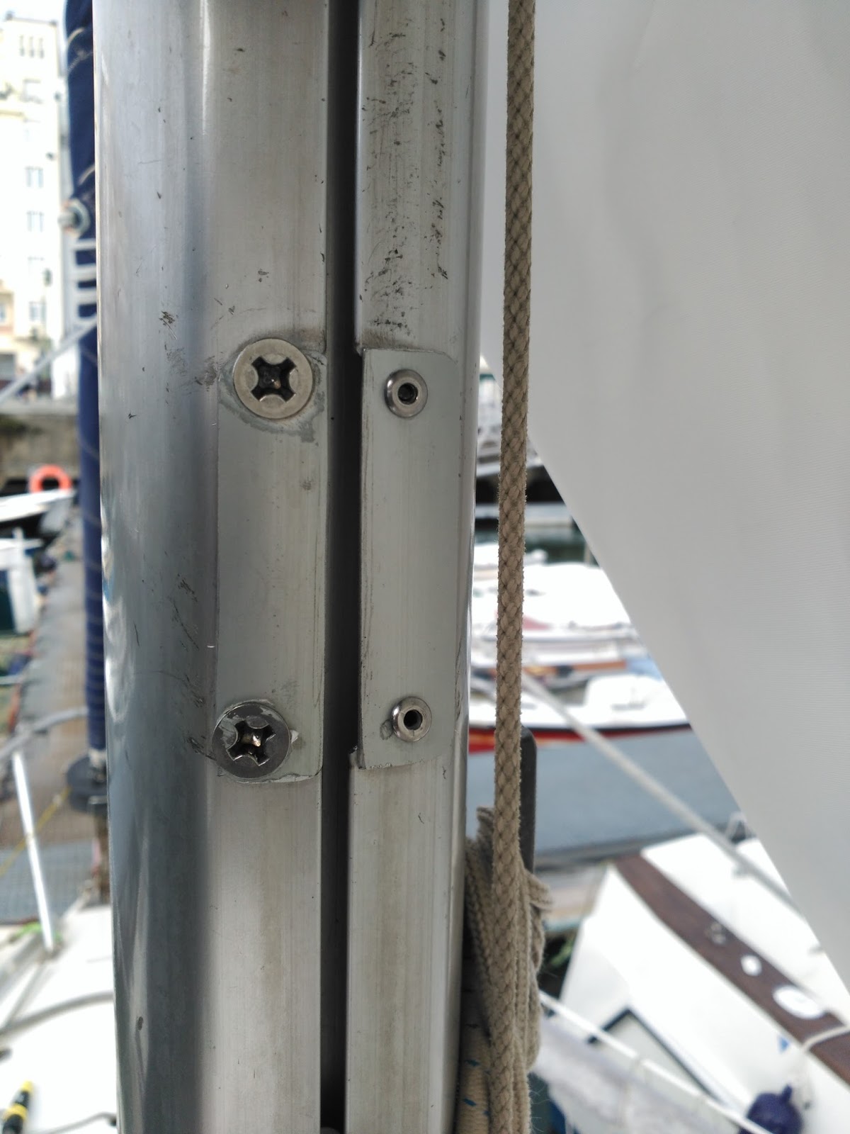 Aquí podéis ver lo que he intentado para cerrar el rail y que los patines caigan hasta la botavara. Las chapitas están sujetas aprovechando los agujeritos que ya había. La de estribor con remaches ya que con una sola chapita los patines entran y salen, y la de babor con tornillos para simplificarme el sacar la vela y no depender de un taladro para ello.