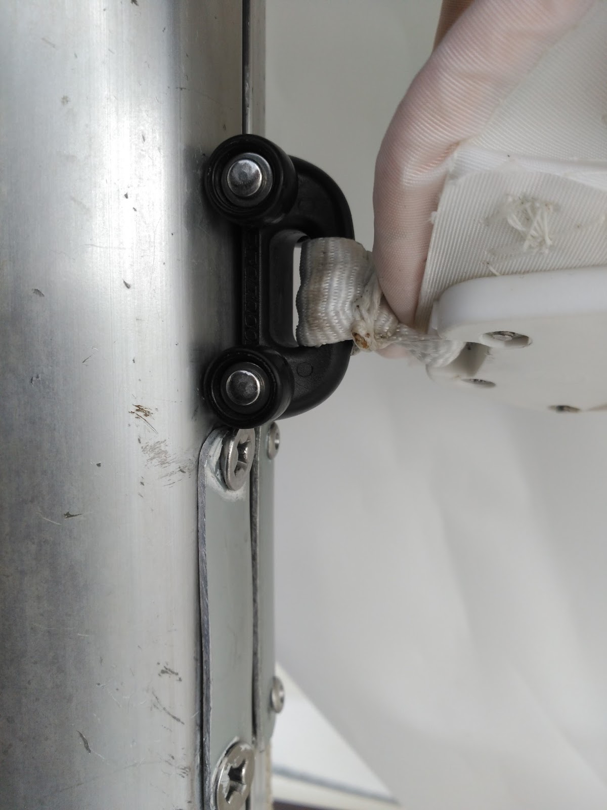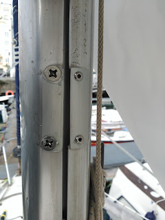 tengo que volver a cerrarlo para que los patines puedan descender hasta la botavara cuando tenga que tomar rizos (si bloqueo el rail encima del ensanche el pujamen queda muy alto). He probado con unas chapitas de aluminio atornilladas: