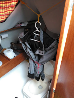 De él he pasado un cabito hasta la pared de enfrente, y en mitad del cabito he hecho una gaza. En esa gaza cuelgo, con perchas, los trajes de agua mojados, y la parte inferior de los trajes la recojo con una cinta o un pulpo. Todo el agua escurre directamente dentro del WC: