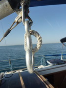 Y no hay que padecer por el desgaste del cabo. Con poco viento o moderado solo hay que templarlo o no pasa la mayor al trasluchar. Si hay rasca hay que darle un poco mas tensión que templado, yo le estiro con moderación y la vela pasa suave, aunque siempre acompaño la escota con la mano, pero no la cazo apenas y esto facilita mucho la trasluchada a solo.Mi barco es un 31 pies y lleva el carro de mayor en la bañera, el cabo que pasa por el 8 es un resto de escota de 10mm.