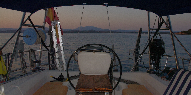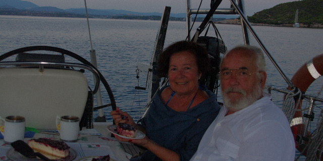 Maniobra perfecta, ancla abajo, cincuenta metros de cadena en seis metros de agua, en previsión de los sucesivos enganches a que nos someterán los charteristas novatos en su primer atraque tras salir de Atenas, y dos cabos a popa que recogen unos amigos de La Taberna del Puerto que nos han visto entrar.