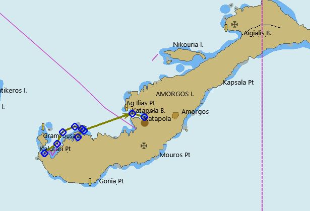 El trayecto, tramo, derrota o etapa de hoy es corta, y nos lleva al puerto de Katapola en la misma isla de Amorgós.