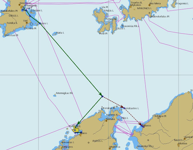 503.566 esta es el copy pega de mi nueva entrada al blog siguiendo las incomodas normas de esta taberna. ¡¡con lo facil que es poner un enlace y que el que quiera lo pinche!! ![]() ![]() ![]() 09 de mayo 2018 ¡¡Que susto!! de Syros a Paros Columnas de Parokia La navegación a vela impulsados por un escaso norte es placentera pero se nos sigue negando la pesca. Estamos a cero. Aunque inicialmente nuestra ruta es a Nasos a poco mas de la mitad de camino, decidimos hacer un cambio y dirigirnos hacia Parox y en concreto al puerto de Parokia, que solo pudimos ver de noche y recordábamos que había una muy bonita ciudad antigua en el mismo puerto. Ruta inicial y derrota final A una distancia de la costa de casi una milla y en las cercanías ponemos motor y recogemos las cañas de curricán. Para recoger las muestras me pongo de espaldas a la proa para accionar los carretes y cuando ya tengo en la mano la cucharilla me vuelvo a buscar el corcho donde la pincho. Por el rabillo del ojo veo algo que me eriza el cabello y dispara mi adrenalina, dando un salto hacia el mando del motor cambiando a la marcha atrás al tope de vueltas que permite el motor hasta detener el barco. Hemos quedado a menos de cinco metros de una roca que emerge apenas medio metro. No quiero ni pensar en el daño que hubiéramos causado al casco, seguramente de forma irreversible. El bajo está marcado en las cartas, pero a la escala que se maneja el ploter no se aprecia. Pero no voy a buscar ninguna escusa. La culpa es solo mía, que no seguía los consejos que doy a los demás, y es que por Grecia hay que navegar de día, revisar las cartas y las fotos de satélite y así todo llevar un ojo puesto en el mar. Este es solo uno de los miles de ellos que hay por todos los lados. Esta vez nos hemos salvado, aunque aun me siguen temblando las piernas del susto que nos hemos llevado. Parokia no nos defrauda y podemos pasear tranquilamente por sus calles y sacar fotos y mas fotos.