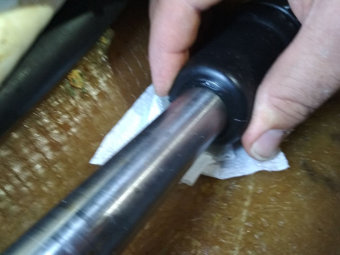 Así es como se purga la bocina si tienes fuerza en los dedos y la bocina es flexible. Se presiona por los lados y lo que es un círculo perfecto de goma rodeando el eje se convierte en un óvalo cuyos extremos superior e inferior se separan del eje, dejando pasar agua (pero también facilitando el acceso de la pajita).