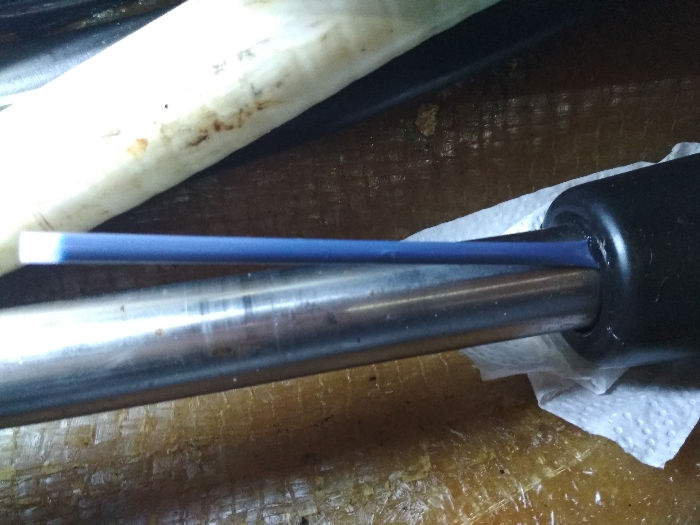 Esta es mi bocina. Yo pongo un papel de cocina debajo y así sé si entra agua o no, cada vez que navego miro si el papel está deformado aunque seco. Si es así, ha habido agua aunque se haya evaporado. En este caso, lo he puesto para purgar la bocina antes de echarle grasa.